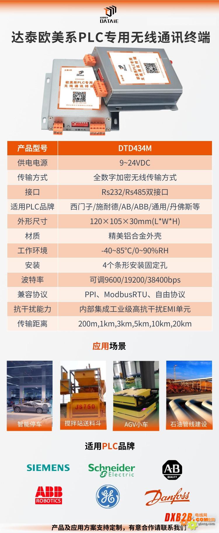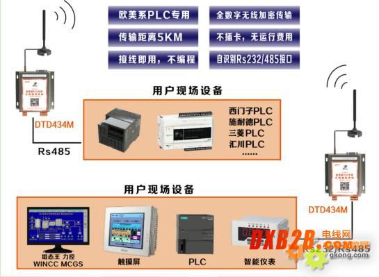 达泰PLC数据无线传输终端DTD434M系列对PLC通讯特点而开发的无线通讯产品,嵌RS232/RS485双接口,完全兼容并自适应MODBUS RTU、PPI、N:N、HOST Link、Profibus-DP等通讯协议等。可与各类PLC组成无线测控网络,无线可靠传输距离达到20公里左右信号穿墙绕射,集成EMI抗干扰滤波单元,经过了十年以上工业现场运行考验,可确保工作于各种恶劣环境工业场合长期运行。