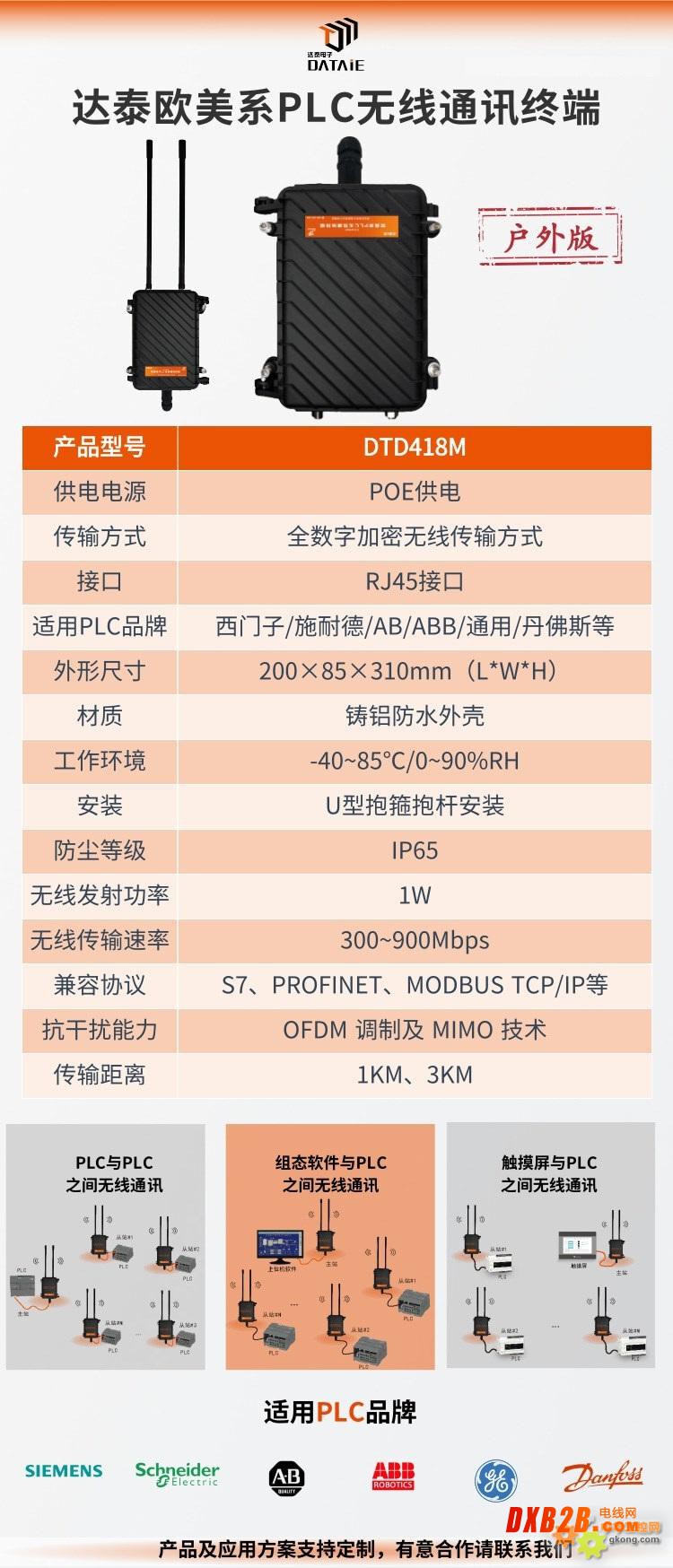 DTD418M 达泰欧美系PLC无线通讯终端,采用 2x2 两发两收无线架构,空中传输速率高达 300Mbps,兼容西门子S7协议、Profinet协议、Modbus TCP/IP等通讯协议,并采用全数字加密技术,使无线可靠传输距离达到1-3KM范围内均可使用。