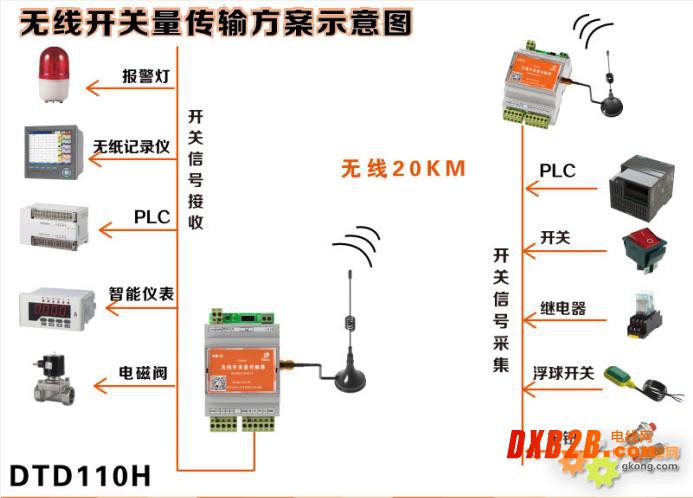 达泰1系无线开关量信号传输器 DTD110H实现点对点的开关量信号远传功能,发射端4-16路开关量输入,与接收端4-16路开关量输出信号一一对应。还可以选用双向开关量传输终端DTD112H,每个终端有4-8DI/4-8DO,两端的模块输入与输出相互对应。